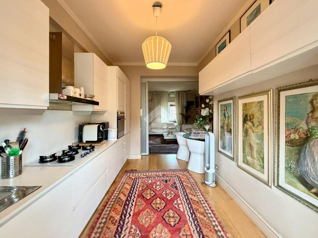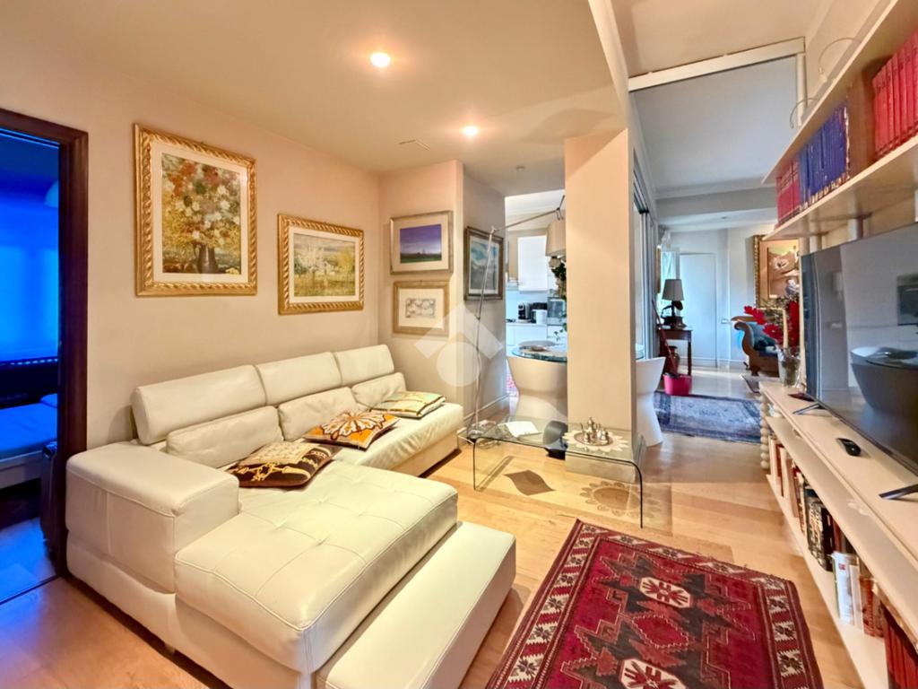 Entrando nell'appartamento ci accoglie la zona giorno composta da comodo salone con cucina a vista e uscita su balcone. Questa zona, funzionale ed elegante, è completa di ampio ripostiglio. La cucina può diventare separata grazie alla presenza di due porte scorrevoli a vetro che garantiscono privacy e praticità.