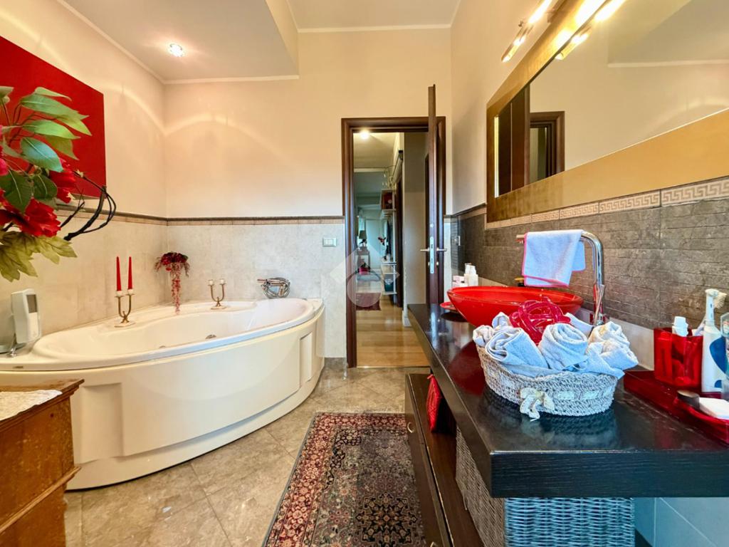Proseguendo troviamo la zona notte, composta da quattro camere da letto, di cui una con bagno in camera finestrato completo di box doccia, e due con ampia cabina armadio. Nel bagno padronale, anch'esso finestrato, troviamo un'elegante vasca idromassaggio.