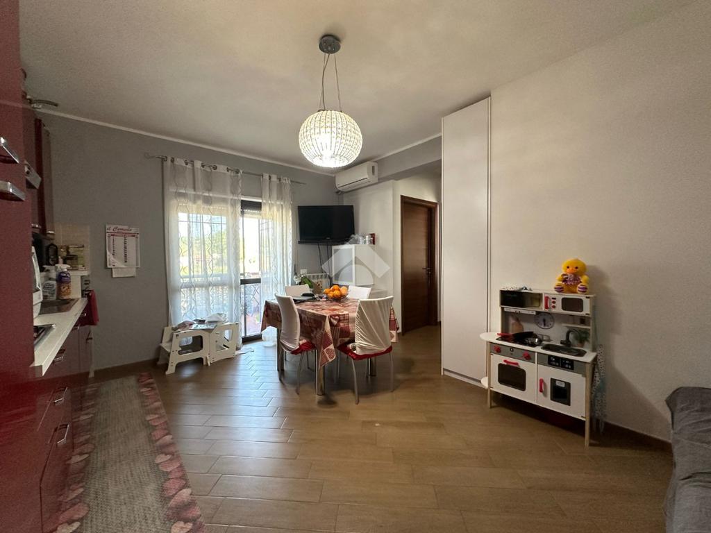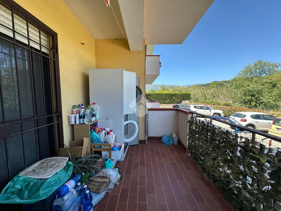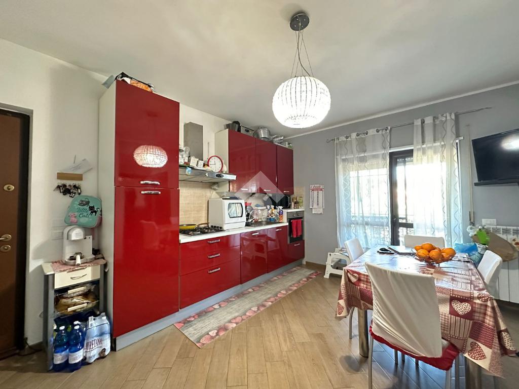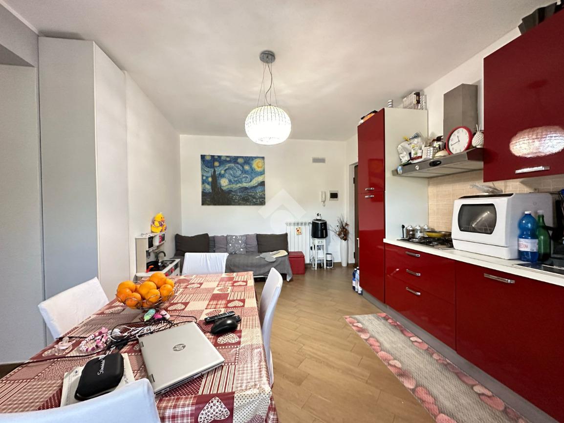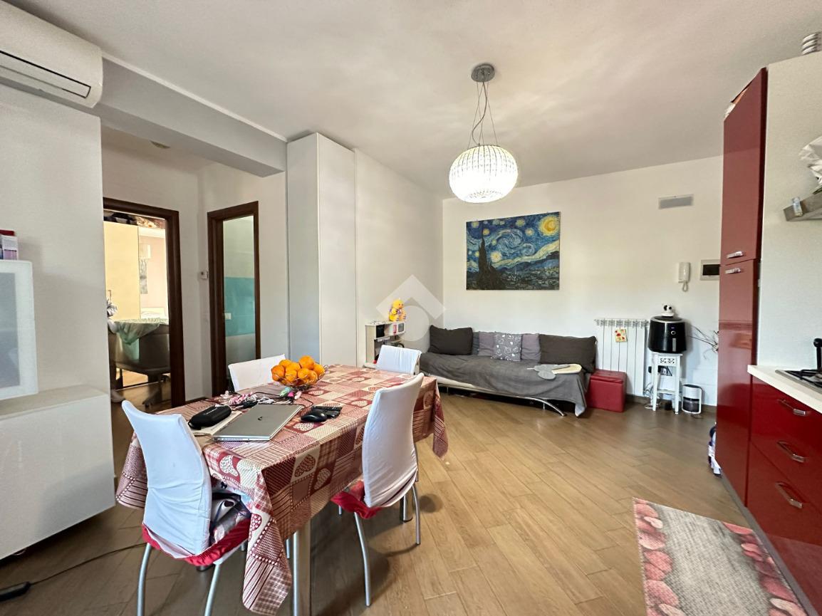 Entrando nell'appartamento ci accoglie il soggiorno con cucina a vista e con uscita su comodo terrazzo coperto.